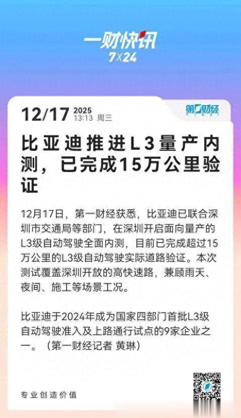 12月17日,有媒体获悉,比亚迪已联合深圳市交通局等部门,在深圳开启面向量产的L3级自动驾驶全面内测,目前已完成超过15万公里的L3级自动驾驶实际道路验证。本次测试以安全为核心,覆盖深圳开放的高快速路,兼顾雨天、夜间、施工等不同场景工况。全面验证L3级别产成熟度和可靠性,为国家L3级自动驾驶落地提供实践依据。