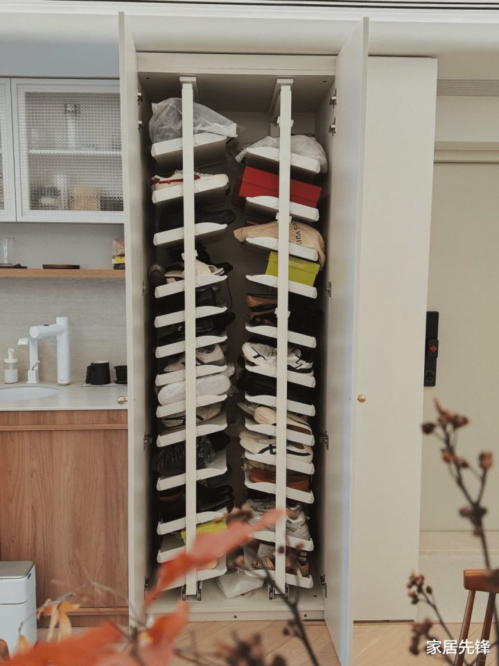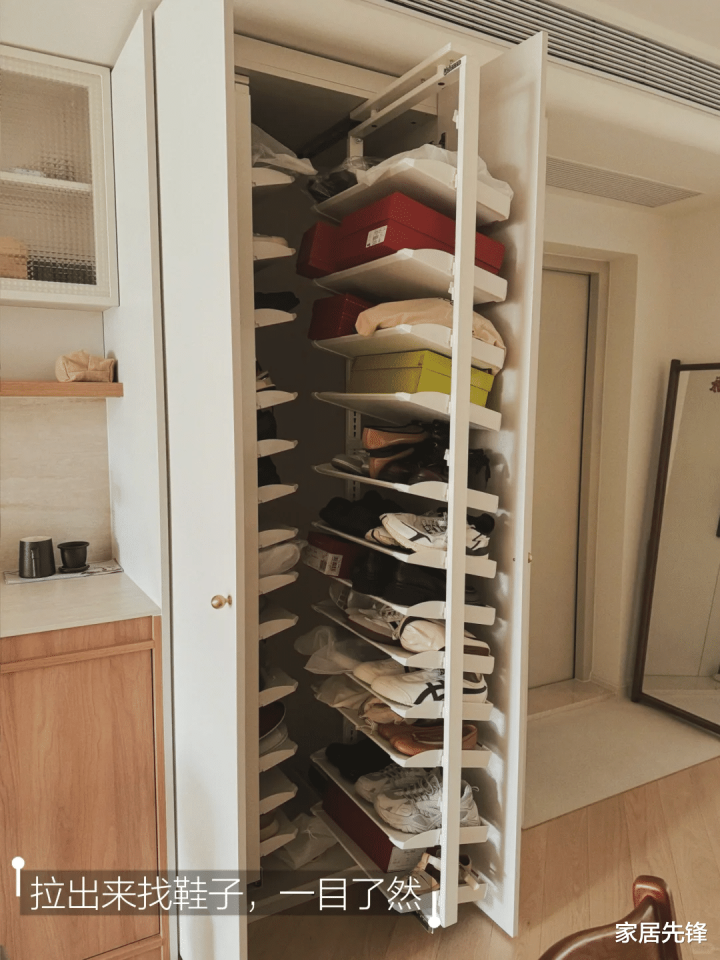 我们只需要在衣帽间或者是在门口玄关的位置设计这样一个推拉鞋架就可以完美解决了,特别小,而且非常能装,一拉出来鞋子一目了然,再也不用担心玄关乱糟糟的。