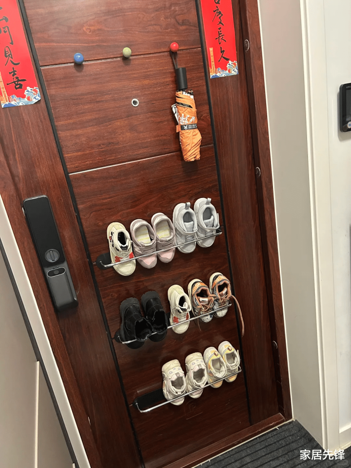 将自己不常穿的鞋子,还有拖鞋全部收纳起来,只放置一些比较常用的,缺点就是高跟鞋,还有大头鞋太厚,放上去可能关不上门。