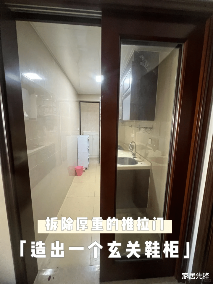 原本厨房是推拉门,厚重又不好看,于是全部拆除,腾出了不到一平方米的空间来定制鞋柜。