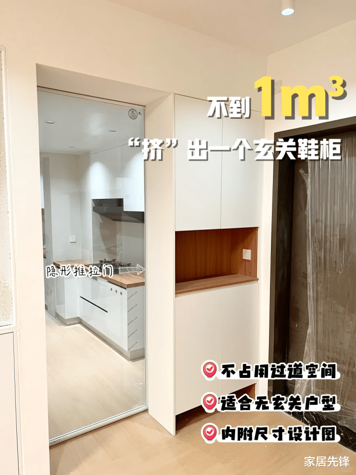 现在非常流行嵌入式鞋柜的装修,它可以利用好空间满足你的所有收纳需求,像下面网友的设计就很绝,左手边就是厨房,现在被他硬生生的挤出了一个鞋柜。